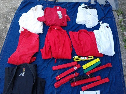 Lot Of 16 Martial Arts Clothing Brazilian GI Jackets Judo Jiu Jitsu Belts Ect.